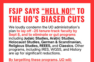 We condemn the UO administration’s plan to lay off ~25 tenure-track faculty by Sept 8and to eliminate or gut programs including Judaic Studies, Arabic…
